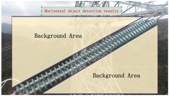 Then, in the object defect detection stage, this paper proposes a two-stage joint detection structure. In the first stage, the complete insulator string is detected, and in the second stage, the defective part is detected in the detected insulator string. Because the insulator string is a narrow and long object and the rotation angle is uncertain, using an object detection algorithm would make it easy to mix too many backgrounds in the pictures of the second stage, making the work of the first stage basically ineffective, as shown in Figure 4. Therefore, this paper introduces rotated object detection technology in the first stage of detection. By detecting the rotating frame of the object, the detection result closer to the shape of the object is obtained so as to remove the interference of the image’s background area.