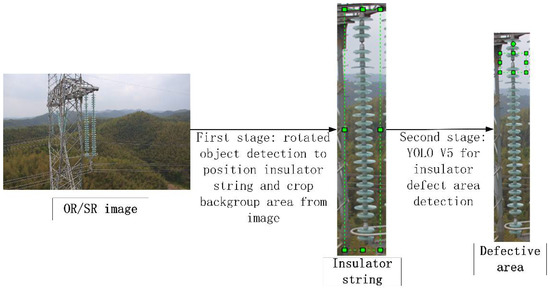 To summarize, the task of insulator defect detection aims to the finding optimal solution of mapping from image OR and SR to insulator defect area. Aiming at the small object problem in this task, this paper proposes the two-stage cascading structure of a defect detection insulator, which can decouple the original complex problem of into two simple optimization problems of and . This method can avoid the problem of small object detection and improve insulator defect detection rate.