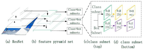 Figure 9 shows the structure of the rotating object detection model, which is inherited from the classical object detection model RetinaNet. The model is composed of classical residual neural network (Resnet), Feature Pyramid Net (Feature Pyramid Net), and several classification/box regression subnets. The residual neural network outputs four different sizes of feature maps, , via ResNet. The output base feature map is fused with , and via up-sampling layers stage by stage and the detection results are outputted via classification subnet and box regression subnet respectively. Unlike RetinaNet, in order to effectively fit a two-dimensional Gaussian distribution , the output of the box subnet is transformed from RetinaNet to . The KLD loss function is adopted according to the transformation relation, as shown in Equation (6):