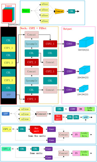 In the structure design of insulator defect detection, Focus structure and CSP1 structure are used as the Backbone network, and CSP2 structure and PAN structure are used as the Neck network. The Focus net structure mainly uses slice operation. The Focus structure mainly adopts the slicing operation. The image of is sliced into , and then the feature map of is formed through the convolution operation of a group of 32 convolution kernels. YOLOv5 draws on the design ideas of CSPNet and designs the CSP structure in the network. Two CSP structures are designed in YOLOv5. The CSP1_X structure is used in the Backbone network, and the other CSP2_X structure is used in the Neck. CSP1 includes two branches, one of which is composed of CBL structure, residual components, and convolutional layers, while the other is a branch that only includes convolutional neural networks. The two branches are cascaded first, and then the deep feature map is obtained through L function operation and CBL structure operation. The CSP2_X structure, similar to the CSP1_X structure, also contains two branches. However, the residual components of the first branch in the CSP2_X structure are replaced with two times the number of CBL. The CSP structure introduced in YOLO V5 can effectively strengthen the network feature extraction and fusion capabilities to achieve better performance. In addition, the PAN structure is derived from the idea of PANet in the field of object segmentation. Two feature maps of the same size are fused via cascade operation so as to achieve the purpose of multi-scale fusion.
