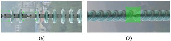 In this study, the insulator image taken by a UAV is used to detect the defect area of the insulator “self-exposure”. Because the number of available defective insulator samples is far less than that of intact insulator samples, which leads to the difference in positive and negative sample distribution, which makes it difficult to develop and deploy the traditional data-driven object detection model. At the same time, because the safety management system of the power grid has strict restrictions on the flight distance between the UAV and the power tower, the UAV cannot obtain snapshots of insulators at close range. This makes the proportion of insulator defect area in many pictures taken by UAV too small, as shown in Figure 3. Thus, insulator defect identification becomes a small object identification problem. Moreover, as shown in the figure, the insulator string is a typical object with a large aspect ratio. Sometimes, the proportion of background area in the object frame formed by horizontal object detection will be relatively large, which is not conducive to improving the proportion of the defect area.