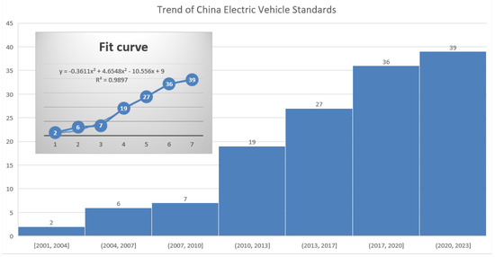 China has published technical standards to regulate the electric vehicle industry; based on data released from the China National Technical Committee of Auto Standardization, the published trend chart is shown in Figure 2. The standards detail requirements and thresholds for detailed technical attributes. The existing literature [2] summarizes the major types of technical standards influencing innovation diffusion, including safety standards and performance standards, which can reduce transaction cost, reduce product uncertainty, avoid or correct bad choices, and provide compatibility standards to improve the communication and interaction capabilities by generating network externalities. Regarding these standards, as most are GB/T standards, which are voluntary rather than mandatory, different stakeholders disagree on their stringency.