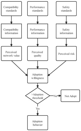 To link the standards-information-behavior layers regarding EV adoption—inspired by the five-stage adoption processes of innovation diffusion theory: awareness, persuasion, decision, implementation and continuation [3]—we divide the innovation-diffusion model into two major stages, product information diffusion and product adoption. Potential adopters become aware of product information, including safety, performance and compatibility with charging stations. Product information and consumers’ perceived values are linked to a persuasion process. Then, consumers compare perceived value to their adoption thresholds at the decision stage.