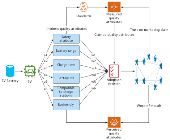 Furthermore, the relationships between standards and quality attributes are explained: technical standards, including safety, performance and compatibility standards, are established based on testing, criteria and other requirements for manufacturers. Based on the standards, the manufacturers can share products’ safety, performance and compatibility information with consumers. The standards are the basis to translate intrinsic attributes into measured attributes. Perceived risk is highly related to the safety features of electric vehicles, so the interlink between product safety information is established. If the EV can easily catch on fire, then the consumer will perceive the EV as a high-risk product. EVs should be tested according to relevant safety standards; thus, the safety standard becomes the base of product safety information. EV performance is based on standardized testing. Perceived quality is related to product performance information, such as battery range, charging time, battery life, etc. Other literature uses additional terms, such as perceived usefulness, quality features, etc. We define performance information based on a performance standard, which ties more closely with the terms we discuss in this paper. EV compatibility standards specify the interfaces or formats, for example, whether the EV can be charged at charging station. If consumers find that the EV is compatible with most of the existing charging stations, then they will perceive there is high charging network value, which is correlated with compatibility information and compatibility standards. Perceived risk, perceived quality and perceived network value are factors influencing adoption willingness, while consumer trust in standards and marketing claims are also factors of adoption willingness. Product information can be diffused through mass media channels and word-of-mouth channels; the latter one is also influenced by user experience.