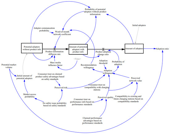 Among the factors influencing the adoption of electric vehicles, technical and charging devices factors, including safety, reliability, battery range, charging time and charging infrastructure, influence consumers’ perceived ease of charging [12]. The adoption rate depends on customers’ perceived value [13], perceived utility [14], perceived quality [15], consumer trust [16] and perceived risk [16]. Kirmani defined perceived quality as consumers’ judgment reference based on product information [17]. Perceived quality is the overall evaluation of the product performance and functions. Perceived risk is consumer’s concern regarding the uncertainty of the product. Goerlandt et al. reviewed the literature related to perceived risk or risk perception and found that consumer trust is fundamentally related to perceived risk [18]. Simsekoglu and Nayum assessed perceived risk, and perceived attributes impact intent to adopt electric vehicles [15]. Febransyah developed an analytic network process (ANP) model to analyze the interlinking of factors related to adoption willingness (purchase intention) and perceived attributes. The model is based on the theory of planned behavior (TPB), which is widely used to research purchase intention and consumer adoption [19]. Poyyamani Sunddararaj et al. studied how factors such as battery charging time, charging infrastructure, distance per charge, etc., affect adoption of electric vehicles and their interconnection with the power grid [20]. Other models are summarized in the literature [21], such as Theory of Reasoned Action (TRA) and Unified Theory of Acceptance and Use of Technology (UTAUT). We focused on the Technology Acceptance Model (TAM) [22], which is widely used for consumer behavior studies, with the most-relevant factors corresponding to product information and other factors, but we also extended it to independent factors such as perceived risk, perceived quality and perceived value based on the literature. The System Dynamics (SD) model of consumer adoption can be divided into two major stages: product information diffusion and product adoption, but standards are not included in the previous study. SD models can be used to simulate adoption behavior, such as in [23,24].