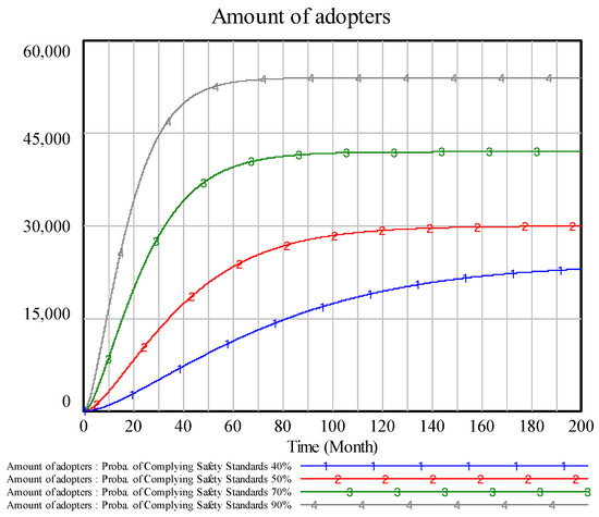 From Figure 7 and Figure 8, the diffusion depth and speed are positively related to the probability of complying with safety standards (probability of no safety issues based on safety standards) and changing the number of adopters who know the product information has a positive relationship with the factor. The factor change for innovation diffusion depth can be explained through the market access and consumer perceived risk mechanism. Decreasing probability from 90% to 40% caused significant drops in diffusion depth. This is also proven by the number of adopters who know the product information—the maximum number at 90% is more than twice that at 40%, indicating that the lower probability of complying with safety standards significantly reduces willingness of adoption and speed of adoption. Further, we found the ratio of potential consumers drops fast with product information dissemination, which means speed to transform potential consumers to actual adopters is accelerated if the product has a higher safety level.