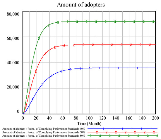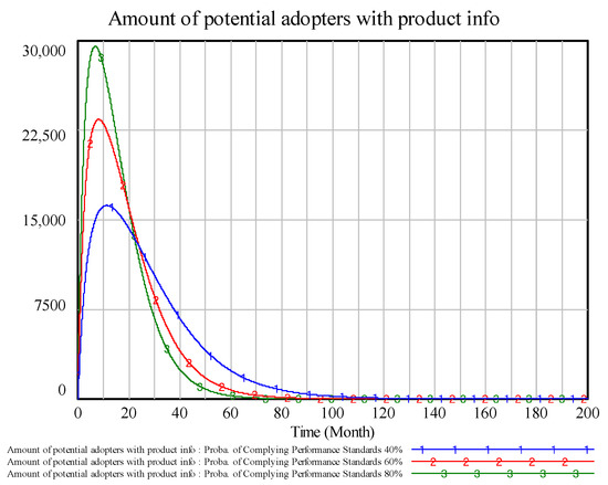 From Figure 9 and Figure 10, probability of complying with performance standards has a positive relationship with adoption depth. With higher product performance levels, the recommendation and marketing mechanisms can be facilitated to increase the number of potential adopters that gain product information, resulting in more potential customers, as the peak number of potential adopters is almost twice at 80% compliance vs. 40%, which indicates that consumer has more trust and willingness to share product information through word-of-mouth. Further, the peak value of potential adopters is higher, which means higher product performance claims reached more potential consumers. Improving performance level is important to increase diffusion depth and numbers of potential consumers. However, the depth cannot reach the mature level, as diffusion depth is lower than probability as there are other factors influencing consumer adoption behavior.