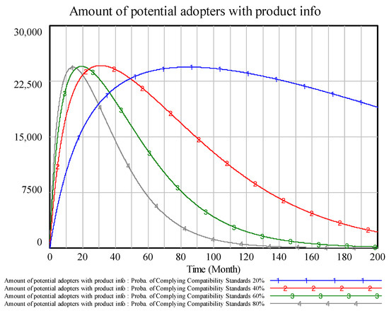 Figure 11 and Figure 12 show that compatibility compliance probability positively impacts innovation diffusion depth and diffusion speed; diffusion speed at 20% is much lower than 40–80%. Further, the rate of change for the decrease of potential consumers is much lower at higher probabilities, showing there is minimum threshold to reach expected diffusion depth. This can be explained by the factor change in the perceived network value of consumers, especially in the early stages of adoption. The compatibility influence is much higher than in the later stages, indicating that EV firm investment in compatibility could play an important role during the early competition stage. Further, for the compatibility factor 60% to 80%, innovation diffusion depth has no big difference, which means there is a high threshold above which there is not a big change of adopters. The peak value of potential gained with product information is similar, while the speed to reach the peak value is positively correlated with the factor, indicating information diffusion speed can be higher for more-compatible products, while probability level has no big effect on the maximum number of potential consumers.