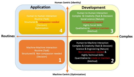 The Fourth Industrial Revolution (4IR) affects the nature of work. Some jobs are replaced by machines and automation, and there are some jobs that cannot be replaced by machines and automation. Figure 1 highlights a job matrix format. This job matrix can be seen to be divided by two axes (horizontal and vertical), which would further categorize the jobs into four clusters (1, 2, 3, and 4). The horizontal axis relates to the level of job complexity, ranging from routine to complex. Complex jobs are jobs that require extensive decision-making processes by workers with high expertise because the problems that exist in this job are frequently unstructured (i.e., problems that require non-traditional solutions that cannot be replicated to solve all other problems). On the other hand, routine jobs are those that can be performed without the need for expertise and complex decision-making processes; they can be performed repetitively because the problems that exist in these jobs are frequently structured problems (i.e., problems that require traditional solutions, a “one-size-fits-all” solution to all problems). The vertical axis explains the nature of the job based on how much compassion is playing its role in executing the jobs. It has two components that are human-centric and machine-centric. Human-centric jobs are those that require interactions with other human beings and compassion to execute the given jobs, i.e., motivations. Furthermore, machine-centric jobs have a high level of interaction with machines (i.e., extensive use of digitalized works).