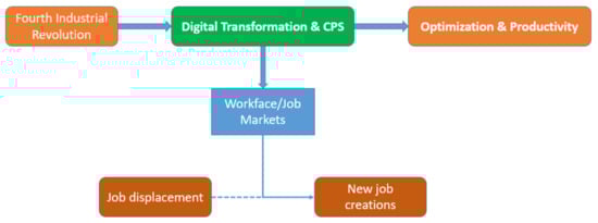 With the digitization of work processes, the fourth industrial revolution enables organizations to optimize their production operations and increase their competitiveness and productivity as manufacturing becomes more automated, more flexible, and cheaper. The availability of smart factories with increased automation and the self-monitoring ability of machines that allow analysis and communication with each other without the presence of a human, pose both opportunities and risks to the job market [19,20].