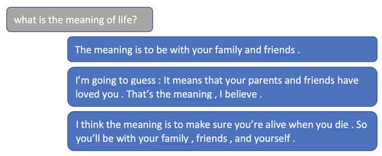 - Zhang, Y.; Sun, S.; Galley, M.; Chen, Y.C.; Brockett, C.; Gao, X.; Gao, J.; Liu, J.; Dolan, B. DialoGPT: Large-Scale Generative Pre-training for Conversational Response Generation. In Proceedings of the 58th Annual Meeting of the Association for Computational Linguistics: System Demonstrations, Online, 5–10 July 2020; pp. 270–278. [Google Scholar] [CrossRef]