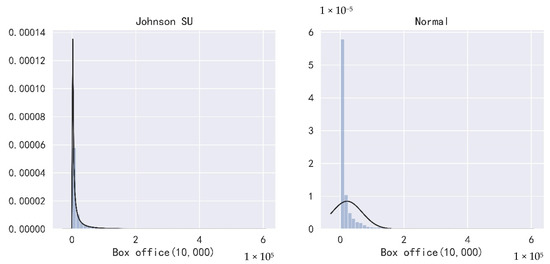 By deleting duplicate data and missing box office data in ENDATA, 5683 film data were left after processing, and the top 2000 films were used for box office prediction modeling after integrating the missing situations of other features of films. By checking the distribution of the film box office, illustrated in Figure 1, it can be found that compared with the normal distribution, the distribution of the film box office is more consistent with the unbounded Johnson distribution. Thus, the value of the box office must be converted before regression.