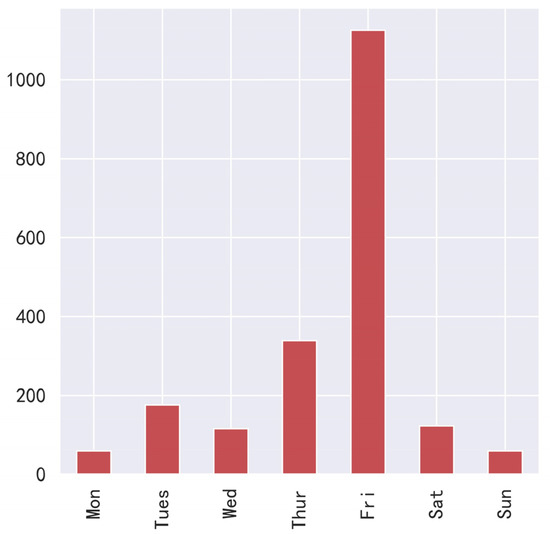 According to the release date of movies, we added the release year, release date number, and release day of the week to each movie’s data. The release date feature is a string. The first four characters are obtained by slicing the string to obtain the release year feature of the movie. Release date numbers are obtained by converting release dates to numbers in Excel. Use the strptime function of the datetime library to convert the release date to something similar to %Y/%m/%d, then call weekday and +1 to obtain the day of the week. Figure 3 and Figure 4 show the distribution of the release year and the day of the week of the top 2000 movies at the box office.