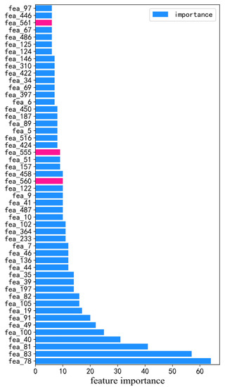 In order to study the correlation between the epidemic factors and the box office, we screened the data of 187 movies released from January 2020 to November 2021 from the data used above. The same data processing process was adopted, and then the LightGBM algorithm was used for modeling. The R2 of the model is 0.8686, The MAPE of the model is 18.94%. The feature_importances_ function in the LightGBM module was used to obtain the feature importance of the model, and the top 50 most important features were obtained by sorting the feature importance. The feature importance bar chart is illustrated in Figure 6. The important features of LightGBM and the features’ description are shown in Table 8. It can be seen that the newly confirmed cases one week after release, the existing suspected cases, and the newly confirmed cases 30 days after release all had a great impact on the box office.