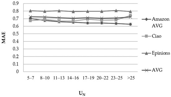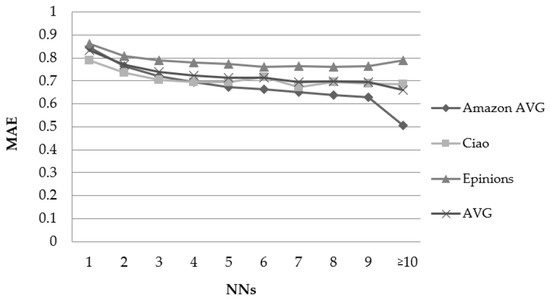 Figure 2 depicts the results obtained concerning the 10 Amazon datasets (on average) and the Epinions and Ciao datasets, using the PCC user similarity metric and considering the user rating average (Uavg) feature. It is noted that the ranges (x–axis) are not the same with the previous factor (and the next ones), since they represent metrics that take not only different values, but also types of values (for example the NNs factor represents the number of near neighbour users that take part in the rating prediction calculation—integer value, while the Uavg represents the average ratings value of the user for whom the rating prediction is being formulated—decimal value).