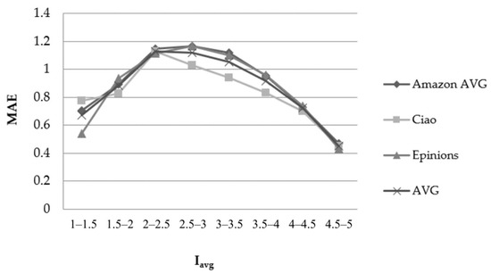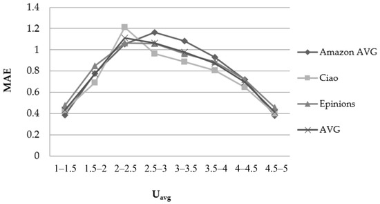 - For the user’s U average ratings value (Uavg–feature), the values from the minimum to the maximum rating values are examined, with the increment step being equal to 0.5, i.e., the ranges of [1–1.5), [1.5–2), [2, 2.5), [2.5–3), [3–3.5), [4–4.5) and [4.5–5]. Notably, in all datasets used in this study, the ratings ranged from 1 to 5.