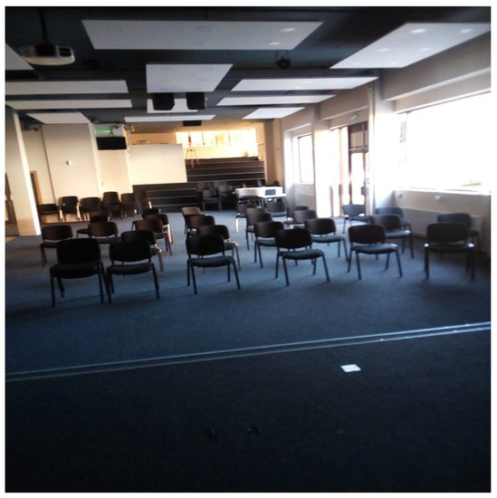 We collect RSSI data at different X, Y ground truth grid points in both LOS and NLOS indoor environments in Destiny College main building in Glasgow city [35]. The three considered environments are 8 m × 22 m, 15 m × 25 m, and 20 m × 25 m meeting/lecture rooms on the ground floor (floor 0), floor 1, and floor 2, respectively, with varying propagation conditions. One of the two gateways is placed on a table in a corner on floor 0 and another on floor 2. The ED held by a moving user periodically sends a beacon message to the receiver gateways for two-minute transmissions at different grid position points from the three rooms on each of the three floors. The data collected from each environment are concatenated to form a dataset of 1205 and 1269 data samples in LOS and NLOS, respectively. A random sample picture of the data collection site is shown in Figure 2.