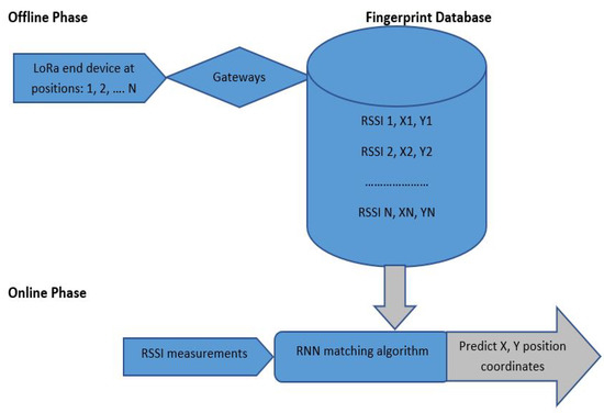 RNN is used to model the developed system to map the input to the output using the collected LoRaWAN RSSI values and corresponding X, Y ground truth coordinates. The developed model is then used to predict any unknown X, Y position coordinates based on ED RSSI values, as shown in Figure 3.