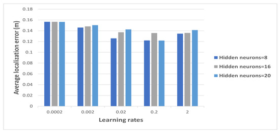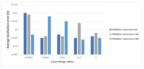 The proposed system’s specific average localization error values obtained while using 8, 16, and 20 hidden neurons and 0.0002, 0.002, 0.02, 0.2, and 2 learning rates in the NLOS scenario are presented in Table 2. From Figure 5, the minimum average localization error is 13.94 m with an accuracy of 44.24% using a learning rate of 0.2 and 20 hidden neurons. The computational training time was 102.16 seconds with the minimum training MSE value of 0.09 m.