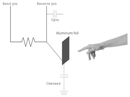In electrical engineering, capacitive sensing is a technology based on the capacitive coupling that can detect and measure anything that is conductive or has a dielectric different from that of air, such as the human body or hand. This is achieved by the effect of each object on the electric field created around the active face of a capacitive sensor. A capacitive sensor works like an open capacitor. An electric field is formed between the measuring electrode and the ground electrode. If a material with a dielectric constant greater than air enters the electric field, the field capacitance increases according to the dielectric constant of that material. The electrodes measure the increase in capacitance and generate an output signal that corresponds to the trigger. Figure 1 illustrates the operating principle behind capacitive sensing. Such metering is based on the RC circuits’ time constant. The time constant of an RC circuit is defined as the time required for the capacitor’s voltage to reach 63.2% of its maximum value when the capacitor is fully charged [18,19].