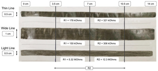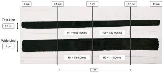 To measure the sheet ohmic resistance of conductive paint (Figure 4), two coats of paint were applied. The measurement results correspond to 0.65 kOhms (3.5 cm) and 1.39 kOhms (7 cm) for the Thin Line. For the Wide Line, 0.5 kOhms (3.5 cm) and 1.1 KOhms (7 cm) were measured respectively.