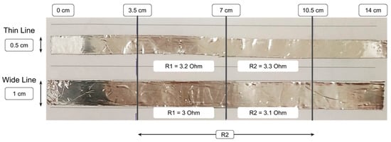 A noticeable difference was observed during the ohmic sheet resistance measurement of the aluminum tape’s strips (Figure 3), in which the result for the Thin Line (0.5 cm) was 3.2 Ohms (3.5 cm) and 3.3 Ohms (7 cm), respectively. In the Wide Line (1 cm), the measurements did not show large variations from those of the Thin Line and as a result, we obtained 3 Ohms and 3.1 Ohms (7 cm), respectively. As a result, we can notice that the amount of material in the given case has minimal effect on the change of its conductivity.