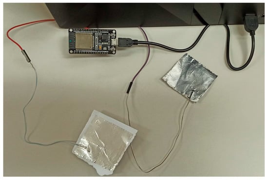 Figure 5 illustrates the connection of our DIY capacitive sensors with the touch pins of an Espressif ESP32 development board [20]. The integrated touch pins of the EPS32 microcontroller were found to be a great advantage as it was not necessary to use two different pins as shown in Figure 1 in order to create an equivalent RC circuit for reading the capacitance change, nor a capacitive sensing library. This process (e.g., reading) is automatically completed inside the ESP32′s firmware thus the touch pins are easily and reliably processed just using the touchRead() function, as is depicted in the following quote from our code. This also saves pins on the microcontroller for future use.