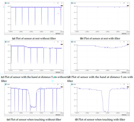 As it is depicted in Quote 1, the Median Filter Library [21] is used as a means for smoothing sensor readings and outliers’ cancellation. In Figure 6a,c,e the noise that occurs during the continuous reading of the sensor is noticeable counter to Figure 6b,d,f, that show the application of the Median Filter over the input signals. The values read by the touch pins are displayed on the vertical axis and the time is displayed on the horizontal axis. To achieve the best possible filtering, sample windows of different sizes were tested (10, 20, 30 number of samples). Regarding the smallest sample window (10 samples), a faster response of all three was observed but with a slight instability. Then, for the sample window of 20 samples, it was observed that its responsiveness was slightly slower but with improved stability and finally, for the value window of 30 samples the responsiveness was slower but with better stability in random disturbances compared to the other three. Taking into consideration that the application domains of our sensors require relatively fast response from the sensors, we concluded that the best choice for our case was a value window of 20 samples. Hence, this is the size of the Median filter window used hereafter. Figure 6 illustrates the behavior of the proposed capacitive sensor without filtering and when applying filtering with the Median filter window of 20 samples. It is obvious that the behavior of the sensor after such filtering is quite stable, and the readings acquired very reliable.
