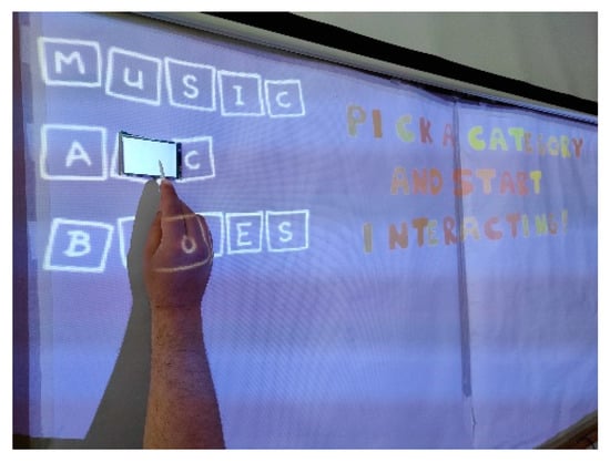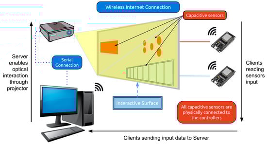 As it was mentioned in the Introduction, the present work focuses on the craft of an interactive tangible and layered dashboard integrating capacitive sensing that can be easily and inexpensively implemented from electronics novices, in a DIY way. Our aim is this dashboard, along with a typical projector displaying graphics on it, to be used as an interactive surface oriented mainly to educational, advertising, or entertaining purposes. The projection of graphics over the surface will take place by applying the Projection Mapping technique, so an impressive result is achieved for the users [22,23]. The purpose is capacitive sensing in combination with the Projection Mapping technique to compose a fully functional and interactive system. Figure 7 illustrates the high-level architecture of our system. For demonstration purposes, an educational scenario was selected, that is oriented mainly to children.
