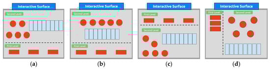 Then, the optimal layout for the placement of the sensors on the surface had to be found. To this end, four different layouts were considered, which are shown in Figure 8. Among them, the first two (Figure 8a,b) expose the second level of the surface, higher than the menu level. These seem to be ideal for users with medium height, since they prohibit shorter persons from reaching the sensors on the second level, while forcing taller persons to stoop. Exactly the opposite takes place with the third layout (Figure 8c), where the first level is situated higher than the second one. The fourth layout (Figure 8d) exposes both levels of operation at the same height, so it seems to be more convenient for domestic use. Taking into consideration that the target group of the proposed construction is mostly children, we decided to go with the fourth layout (Figure 8d).