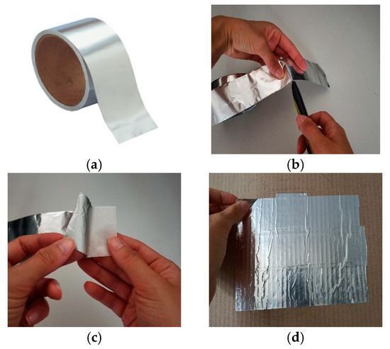 (a) Aluminum adhesive tape (b) Cutting the tape (c) Preparing for installation (d) Placement on the surface.