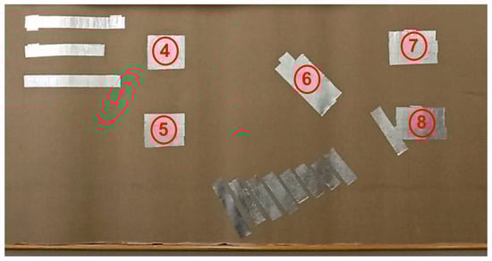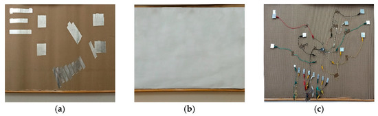 As a basis for the construction of our dashboard, a piece of thick brown cardboard about 70 cm × 150 cm in size, was selected. This is a very affordable solution, trivial to find, and at the same time easy to manage. Moreover, its easy portability is a plus, considering the final implementation. The cardboard offers this as it can be wrapped even in a roll without affecting the sensors. For the latter, pieces of adhesive aluminum tape were placed on the front side of the cardboard, which were thereafter the touch sensors (Figure 9). To keep the front side as simple and flat as possible, slits were made in the cardboard, so the self-adhesive aluminum tape passes through to the backside of the surface. With this technique continuity was achieved between the front and the backside of the construction. All the wiring between sensors and microcontrollers, as well as the microcontrollers themselves, were placed at the backside, thus keeping the front-side of the surface tidy. Figure 10 illustrates the front and the back side of the surface. The front-side was finally covered with white paper for hiding the sensors from users and demonstrating a uniform layout ready for projection.