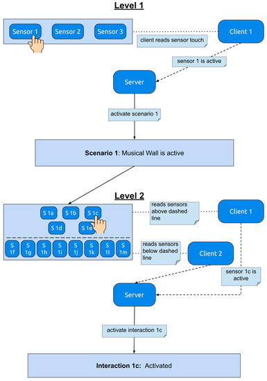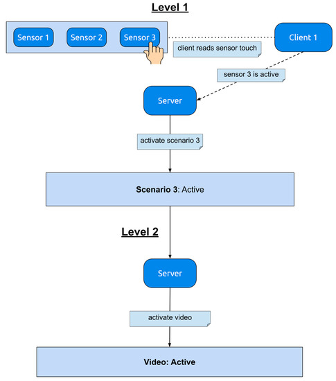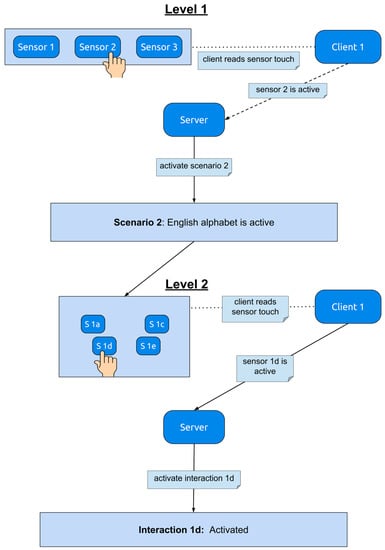 In our case, the total number of sensors on the tangible surface are sixteen and are grouped according to the performed scenario, each time. The scenarios are interchanged via a three-button menu at the first level of the surface; one button for each scenario. For example, when Scenario 1 is activated by pressing the associated button, thirteen different interactions are enabled at the second level of the surface. The same sensors are also available for Scenarios 2 and 3, so the total interactions that can be potentially supported over our surface are thirty-nine. However, not all of them have been enabled, since it was the authors’ choice for each scenario to demonstrate a different number of interactions to the users. So, thirteen interactions are enabled for the first scenario, four for the second and none for the third one. This layered architecture of the second level of the surface, also spares the inputs of the microcontrollers since each touch sensor does not need to correspond to just one action. The distinction between layers is achieved via software. Hence, in the current version of the proposed surface three different layers of operations are supported at present, one layer for each menu button. For each layer, as it was mentioned, up to thirteen different actions can be supported. With one more menu button, one more layer of operation with the same number of actions could be supported, etc.