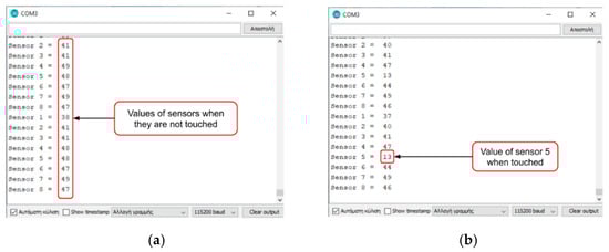 Sensor readings when not touched (a) and when touched (b), shown side by side.