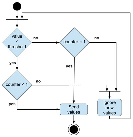 As the sensor values are read continuously, it was necessary in the implementation to find a way to avoid debouncing and understand the prolonged touch events on the sensors. In our implementation, a prolonged touch of a sensor is treated as a single touch and not as multiple, so every interaction with our Server remains active as long as a sensor is touched. In order to properly recognize touch events, release events and prolonged touch events, over our sensors, the two following checks are performed: (a) threshold check and (b) counter check. As it was previously discussed, the threshold differentiates a touch event from a release event. In addition, a counter is used as a flag to keep only the first reading from the sensor and ignore the rest, until the status of the sensor changes again. This way a prolonged touch of a sensor is treated as an individual one. Figure 15 depicts the algorithm that determines when a touch event or a release event is sent to the server. When the reading from the sensor is below the threshold and the counter equals zero, a touch event is sent to the Server. Then the counter increases to 1 so all next sensor readings with values below the threshold are not communicated to the Server. A release event is sent to the Server only when the reading from the sensor is above the threshold and the counter equals 1. Then the counter decreases again to zero so only one release event is sent to the Server.