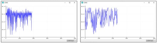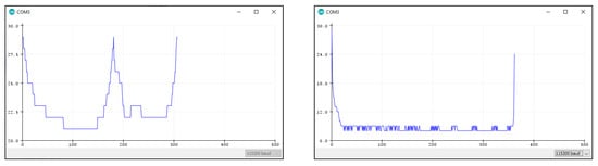 As it was discussed in Section 3.1.3, due to the ‘prone to noise’ nature of our touch sensors, all readings from the sensors are filtered via a median filter with window size of 20 samples. This eliminates the outliers in a certain degree and makes the readings very reliable. The output of this filter is stored into a variable and when its value is less than the threshold already set, the microcontroller understands that a sensor has been activated. As it is shown in Figure 14, the sensors implemented in the final construction return values close to 40 when they are not touched (Figure 14a). On the contrary, when they are touched, the values they return decrease close to 13 (Figure 14b). After several tests it was decided that the appropriate threshold for safely differentiating a sensor touch event from a sensor release, was the value of 30. A separate variable is assigned to each touch sensor, so the server can identify the sensor that its status has changed.