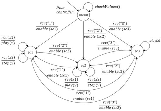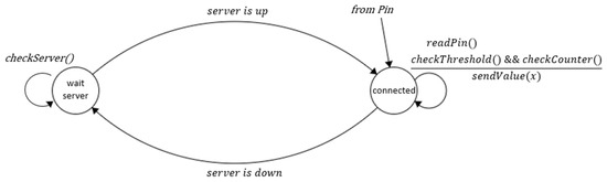 Figure 18 and Figure 19 illustrate the Finite State Machines (FSM) for our Client and Server, respectively. The value sent by the Client to the Server after each touch event is unique for each sensor, so the Server is able to activate the corresponding multimedia content. In Figure 19, with x1 the sensor touch is represented and with x2 the sensor, the release events, respectively.