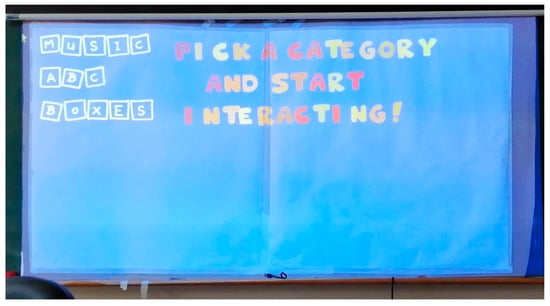 As happens with applications that involve projection mapping, the alignment of projectors with the projection area is critical since this type of application is supported by the illusion it provides to the user. So, several tests were performed before the optimal position and orientation of both projector and tangible surface, were found. Also, the displayed content was tested in many different layouts to find the best one. Then, the content was mapped using Processing with the touch sensors of the surface, so each sensor matches to the corresponding interactive content. The tests were completed, and the position, height, and orientation of the projector were noted on the floor of the room for easy repositioning for future use. The audio playback was achieved through the speakers of the computer unit, which was quite convenient. Initially, the computer’s USB ports were used in the test application to power the microcontrollers. However, this was not possible in the final deployment as the personal computer was placed at least two meters away from the dashboard and the microcontrollers. For this reason, power was supplied to the microcontrollers with the help of power banks, which were placed at the back of the construction along with the wiring and the microcontrollers. Figure 20 illustrates the welcome page of our application which calls the users to start interacting with it using the left-sided menu.
