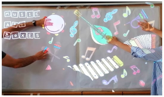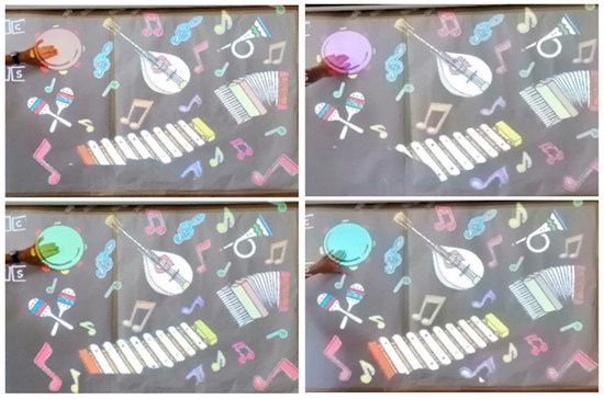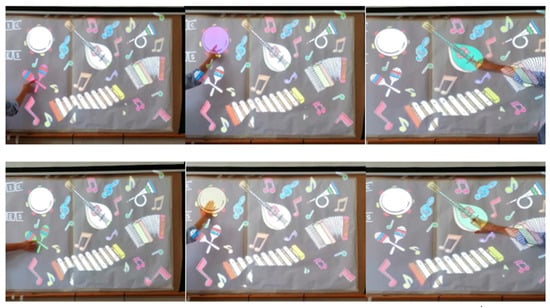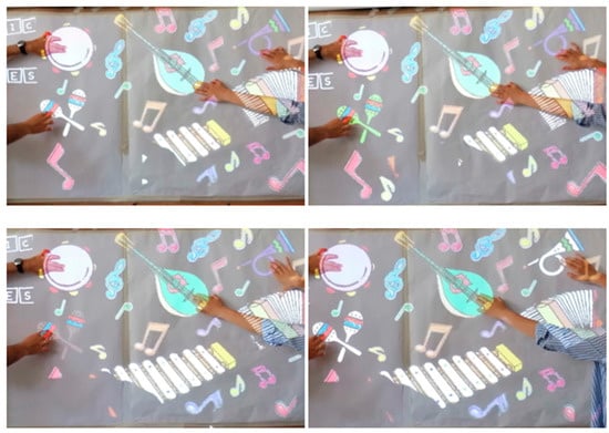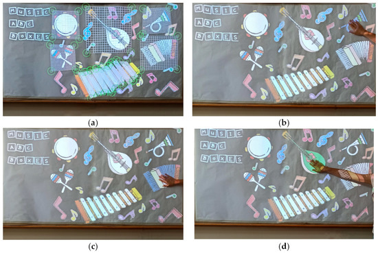 The first scenario that is demonstrated is called Music Wall and from Figure 21 one can easily understand what she/he is going to encounter. Our Music Wall consists of six interactive musical instruments (tambourine, mandolin, trumpet, maracas, accordion, and metallophone) projected by the projector over the tangible surface. The first five correspond to one touch sensor each, as opposed to the last one which uses eight, one sensor for each note of the metallophone. Figure 21a illustrates the mapping of each instrument with the corresponding touch sensor behind the white paper. Each touch sensor activates an acoustic and a visual interaction. The musical interaction corresponds to the sound of each musical instrument, and the playback is carried out with the help of the speakers of the computer unit. Visual interaction is achieved with the help of the projector and makes each object change color with each touch (Figure 21b–d). Figure 22 reveals the simultaneous use of our interactive surface by several users as it was discussed in Section 3.3. The music wall is a very interesting interaction game for children and adults, it is fun and at the same time easy to understand.