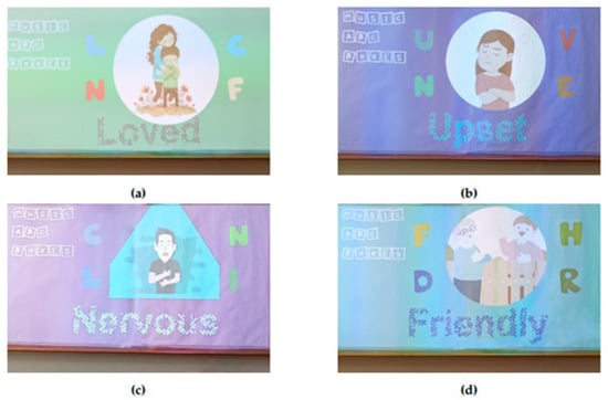 English alphabet scenario. The layer consists of four touch sensors, each associated with a letter of the English alphabet. Here is an example run of the scenario with the letters “L” in (a), “U” in (b), “N” in (c) and “F” in (d), projecting the corresponding English words associated with each letter.