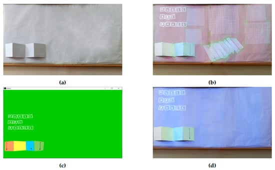 Non-interactive Scenario. Demonstration of projection mapping technique on surfaces with different positions, angles, and inclinations, that appear in (b–d) in relation to the projector. In (a) the 3d construction, made by cardboard and placed in the surface, is shown.