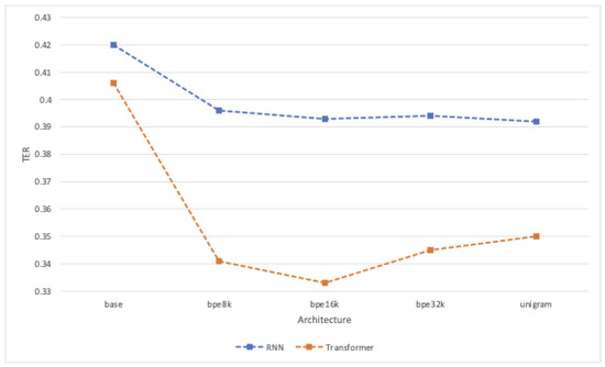Furthermore, the TER scores highlighted in Figure 4 reinforce the findings that using 16k BPE submodels on Transformer architectures leads to a better translation performance. The TER score for the 16k BPE Transformer model is significantly better (0.33) when compared with the baseline performance (0.41).