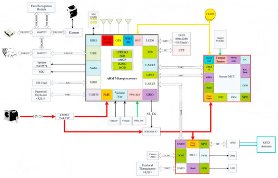 Combined with the current innovation of face payment technology, the system is equipped with a 3D structured light camera with live detection function, which enables dynamic collection and fast recognition. It adopts a1.8 GHz octa-core 64-bit ARM processor core module, and the operating environment is an Android8.1 safe operating system, and the development environment is more secure and convenient. It supports 4G full Netcom, Wi-Fi, and Bluetooth communication methods; built-in contactless card reader module, supports NFC, and can realize omni-channel payment. Other hardware modules of the system are connected to the corresponding interfaces of the core module in the form of peripherals to achieve the functional requirements. The external interface is reserved for the later application software joint Debug port and program upgrade port, and the hardware configuration options (such as contactless module, code scanning module) can be detachable. Under the premise of meeting the standard configuration and considering the upgradeability and scalability of the performance indicators, the face module focuses on heat dissipation and power consumption design. The system security chip has a built-in hardware security encryption module with strong architectural features, supports a variety of encryption security algorithms, and the hardware supports a variety of attack detection functions. The system has a built-in 512 KB security Flash, 64 KB SRAM, and 4 KB OTP storage area, and integrates a wealth of peripheral resources. All peripheral driver software is compatible with the current mainstream security chip software interface, which can be rapidly developed and transplanted, and provides higher frequency and lower power consumption. The system topology and hardware block diagram are shown in Figure 1 and Figure 2. The facial recognition terminal in Figure 1 is a terminal where users use face recognition to realize offline payment transactions. An acquirer is a business system that provides terminal management, capital settlement, and other services for merchants. The face routing gateway receives the face data ciphertext, routing index code, and other information synchronized by the business system of the account management agency, and is used for the addressing routing of offline payment transactions for face recognition. The transfer clearing system provides the transaction transfer clearing function in the financial payment service. The card issuer provides users with account and fund management services. In Figure 2, the hardware system takes the 64-bit ARM processor and the security control module as the core, and other hardware modules are equipped with external core board corresponding interfaces to meet the functional requirements. Modules can be disassembled and are expandable.