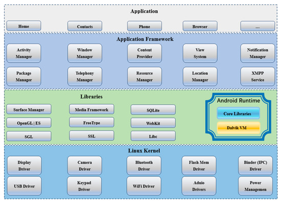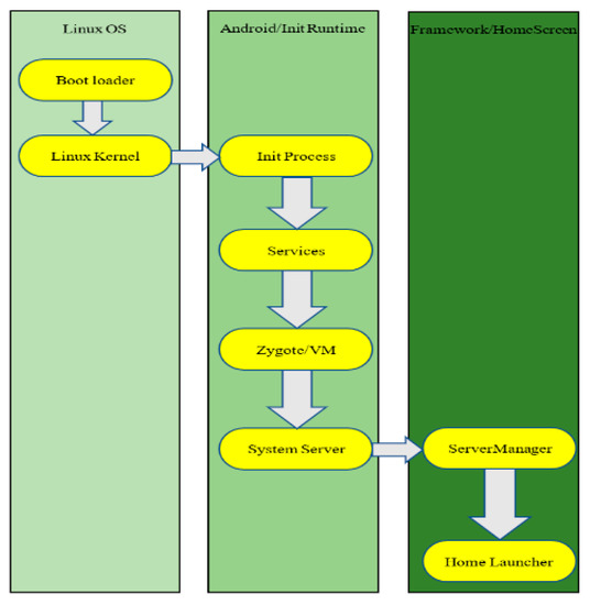 The security module has an encrypted storage function for the internal EEPROM data of the chip, and supports the encrypted operation function. The encryption operation is for the EEPROM as a whole, and all of the stored data in the EEPROM will be stored in ciphertext. The data output by the EEPROM will reach the processor through the decryption channel. Similarly, the data written by the processor into the EEPROM will also reach the EEPROM through the encrypted channel, and will be stored in unreadable plaintext, which increases the security of the memory, making it impossible for the external data to obtain sensitive data information by directly reading the EEPROM data. The overall framework and startup process of the operating system are shown in Figure 5 and Figure 6. The Android architecture is divided into four layers: the application layer, application framework layer, library layer, and kernel layer. The application layer includes all apps on the mobile phone, whether they are built-in or developed by users, and are all developed based on the second layer application framework layer. The application framework layer is the most commonly used layer. It provides a variety of system APIs. Developers use these APIs to build a variety of apps on the upper layer. The third layer consists of two parts: the first part is the native C\C++ system library layer, which mainly provides a series of third-party class libraries, and the second part is the running environment including the Dalvik virtual machine and Java core library. The kernel layer is the bottom layer of the Android system. This is based on the Linux system and mainly provides various hardware drivers.