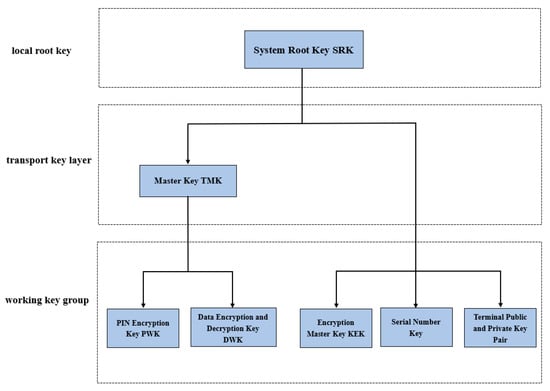 The key management system is the basis of software operation, and also determines the security of the algorithm. The system key management adopts a hierarchical key management mechanism. The key is basically divided into three layers, as shown in Figure 7.