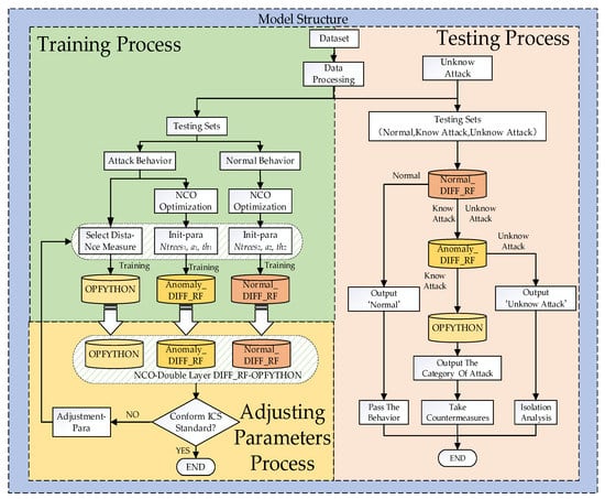 (4) Integrating the NCO module, the double-layer DIFF_RF module, and the OPFYTHON module to obtain a complete intrusion detection model (NCO–double-layer DIFF_RF–OPFYTHON) and optimize the parameters.