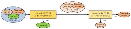 For problem (ii), in this section, we improve the model structure based on the above work. Finally, we propose the NCO–double-layer DIFF_RF–OPFYTHON method. It adds a layer of anomaly_DIFF_RF module to the NCO–normal_DIFF_RF–OPFYTHON model. During the training phase, anomaly_DIFF_RF only fits the known attack traffic among all the network traffic. In the testing phase, it is judged whether the detected network traffic is known attack traffic. The anomaly_DIFF_RF module can only determine whether the detected network traffic is a known attack, which means that it can only classify the detected network traffic into two categories: belonging or not belonging to known attacks. That is to say, the anomaly_DIFF_RF module will classify both normal network traffic and known attack traffic as not unknown attack traffic. However, before the anomaly_DIFF_RF module, the normal_DIFF_RF module will classify the detected network traffic as belonging or not belonging to normal network traffic. By establishing the double-layer DIFF_RF module, consisting of the normal_DIFF_RF module and the anomaly_DIFF_RF module, the detected network traffic is divided into three categories: normal traffic, known attacks, and unknown attacks.