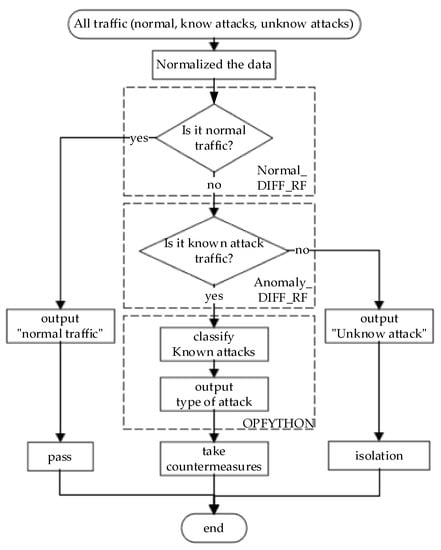 There is often an imbalance of data in the network traffic of ICS. The imbalance of training samples will significantly affect the accuracy of the model. In this section, we propose the normal_DIFF_RF–OPFYTHON detection model. It uses the binary classification normal_DIFF_RF [] module to filter the attack traffic in the detected network traffic firstly, and then uses the multi-classification OPFYTHON [] module to classify the attack traffic. In this way, the OPFYTHON module does not need to fit a large of normal traffic during the training phase, and solves the imbalance of datasets caused by a large of normal network traffic.
