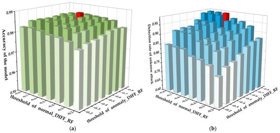 In Figure 5b, the x-axis and y-axis are the same as the Figure 5a, and the z-axis represents the detection rate of unknown attacks. The darker the color of the column, the higher the detection rate of unknown attack of the model, and the red column is the column with the highest detection rate of unknown attack. When the threshold parameter of the normal_DIFF_RF module is −0.8, and the threshold parameter of the anomaly_DIFF_RF module is −0.6, the model has the highest detection rate for unknown attacks, which reaches 98.21%. Under the same parameters, the accuracy of the model reaches 98.39%.