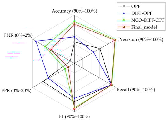 Figure 6 shows the results of OPFYTHON, normal_DIFF_RF–OPFYTHON, NCO– normal_DIFF_RF–OPFYTHON, and NCO–double-layer DIFF_RF–OPFYTHON on the dataset we used in this paper. Since only the NCO–double-layer DIFF_RF–OPFYTHON model can detect unknown attacks, in order to ensure the fairness of the experimental process, the testing set of the experiment shown in Figure 6 eliminates the unknown attacks.